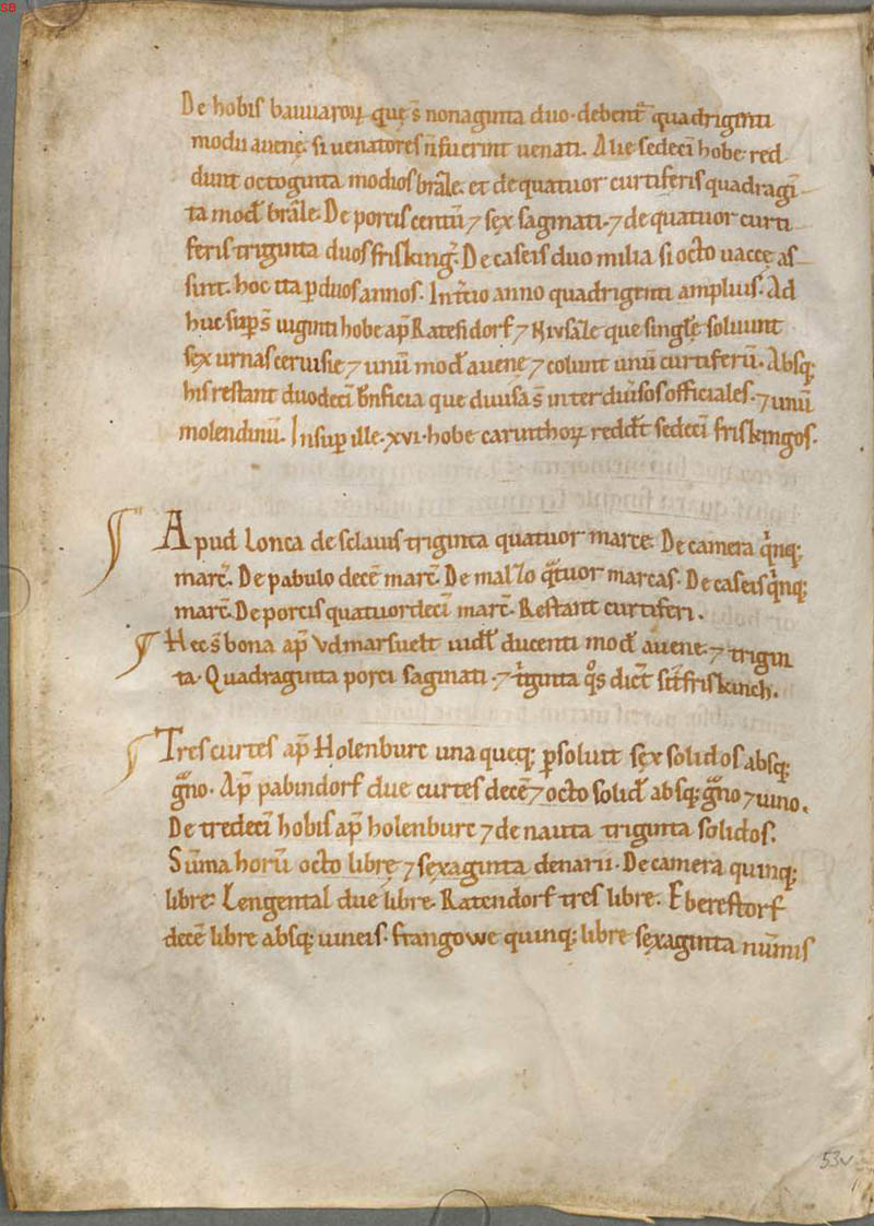 Älteste Freisinger urbarielle Aufzeichnungen (um 1160), angehängt an ein Freisinger Kopialbuch. (Bayerisches Hauptstaatsarchiv, HL Freising 4, fol. 53v/54r)
