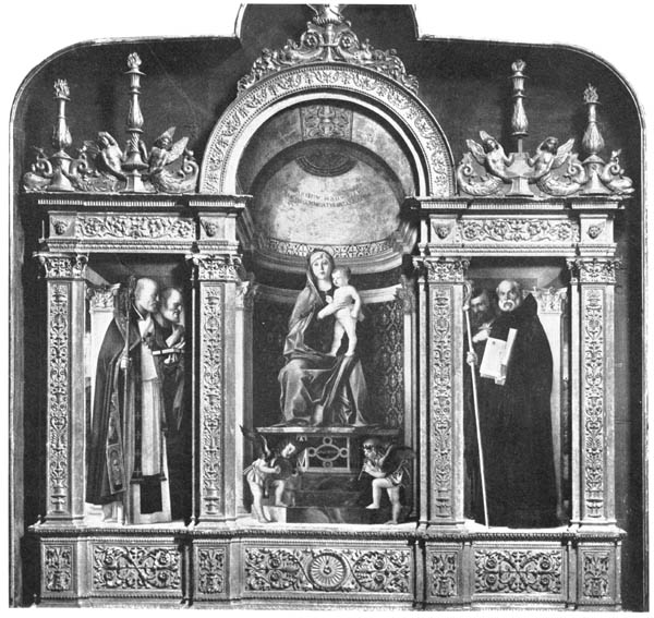 Giovanni Bellinis Triptychon der Madonna mit vier Heiligen in der Frarikirche in Venedig, das Dürer auf seinen Italienreisen kennenlernte, lieferte Anregungen für die Vier Apostel [aus: Giovanni Bellini Des Meisters Gemälde in 207 Abbildungen [Klassiker der Kunst in Gesamtausgaben 36], Stuttgart/Berlin 1930, S104]