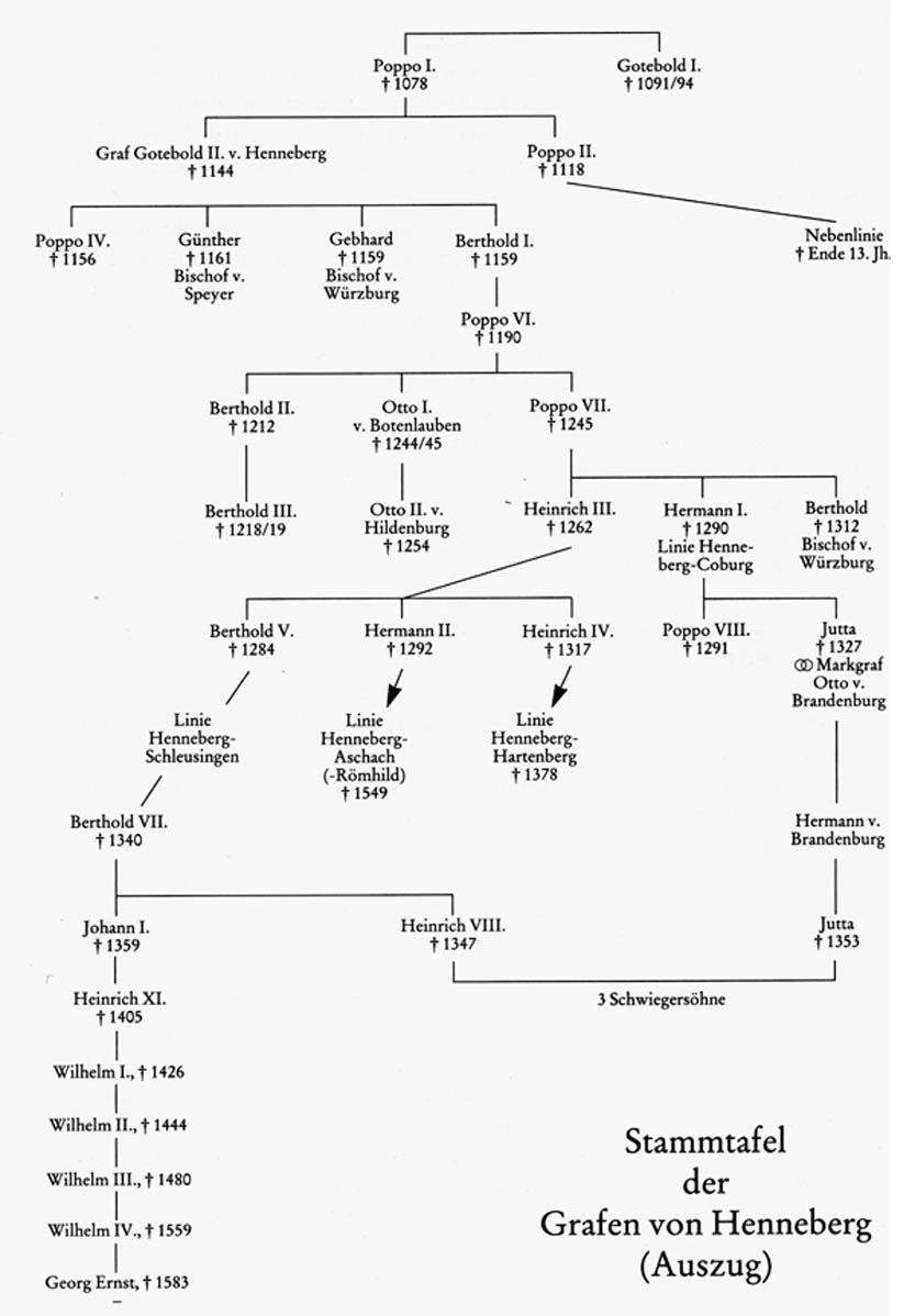 Stammtafel der Grafen von Henneberg. (aus: Peter Kolb/Ernst-Günter Krenig, Unterfränkische Geschichte. 2. Band, Würzburg 1992, 104)
