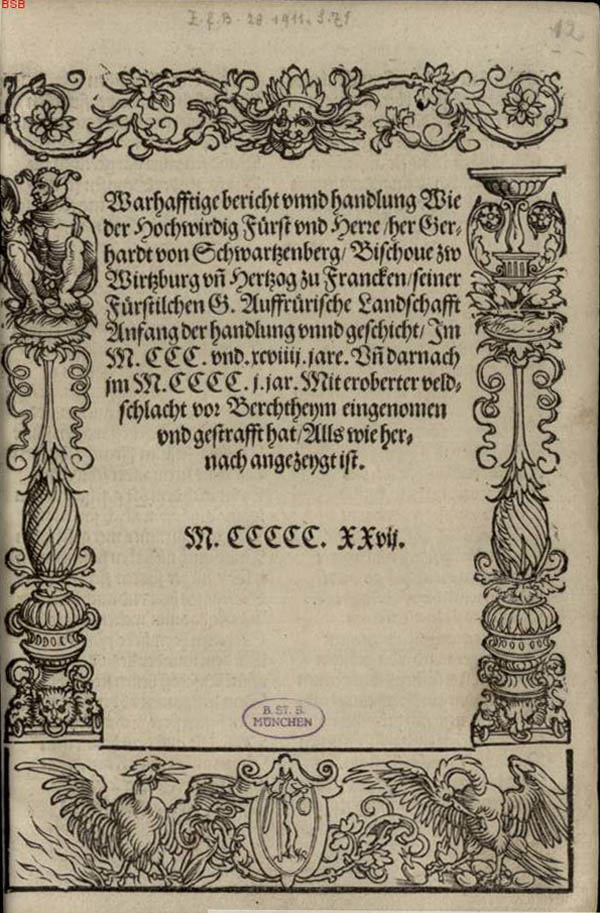 Titelblatt der Druckausgabe von 1527. (Warhafftige bericht unnd handlung …, Bayerische Staatsbibliothek Rar. 1677, Beibd.12)
