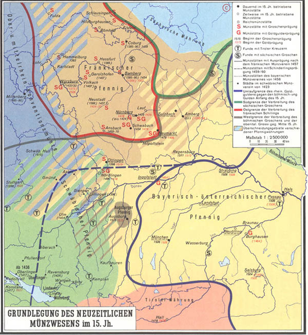 Grundlegung des neuzeitlichen Münzwesens im 15. Jahrhundert. (Max Spindler/Gertrud Diepolder, Bayerischer Geschichtsatlas, München 1969, 23. © Bayerischer Schulbuchverlag)