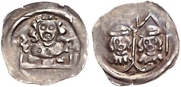 Oberpfalz, Pfalzgraf Ruprecht I. (reg. 1353-1390) oder Ruprecht II. (reg. 1390-1398). Pfennig auf Regensburger Schlag, Münzstätte Amberg. Silber. Durchmesser ca. 16 mm. Brustbild über Mauer, seitlich die Buchstaben R und A (Ruprecht, Amberg)/Zwei weltliche Brustbilder unter Architektur. (Foto: Westfälische Auktionsgesellschaft, Auktion 47, 2008, Nr. 1152)