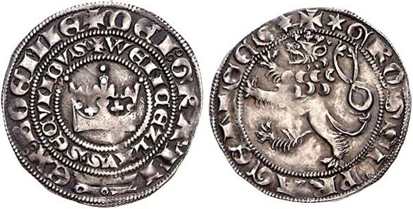 Königreich Böhmen, König Wenzel II. (reg. 1278-1305). Prager Groschen (ab 1300), Münzstätte Kuttenberg. Silber. Durchmesser ca. 25 mm. Gewicht ca. 3,1 g. Krone in zwei Umschriftkreisen/Steigender Löwe nach links. (Foto: Westfälische Auktionsgesellschaft, Auktion 48, 2008, Nr. 3317)