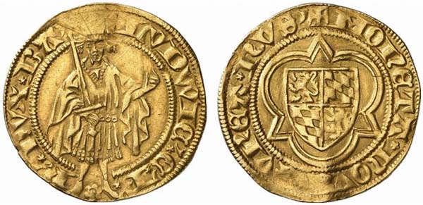 Kurpfalz, Kurfürst Ludwig III. (reg. 1410-1436). Goldgulden (1427/1428), Münzstätte Neustadt an der Weinstraße. Gold. Durchmesser ca. 22 mm. Gewicht 3,46 g. Stehender Kurfürst mit Schwert/Wappen im Dreipass. (Fritz Rudolf Künker GmbH & Co. KG, Foto: Lübke & Wiedemann, Auktion 144, 2008, Nr. 4676)