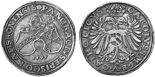Hochstift Regensburg, Bischof Pankraz von Sinzenhofen (reg. 1538-1548). Guldiner 1547, Münzstätte Regensburg. Silber. Durchmesser ca. 40 mm. Gewicht ca. 28,5 g. Mitra und Krummstab über Stifts- und Familienwappen/Reichsdoppeladler. (Fritz Rudolf Künker GmbH & Co. KG, Foto: Lübke & Wiedemann, Auktion 86, 2003, Nr. 1713)