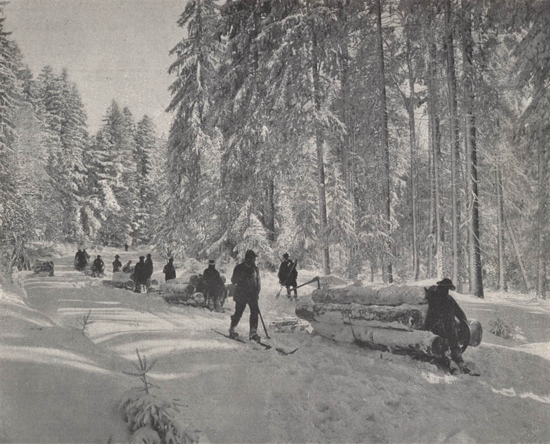 Holzabfuhr im Bayerischen Wald. Abb. aus: Das Bayerland. Illustrierte Wochenschrift für Bayerns Land und Volk, 26. Jg., Nummer 9/10, 5. Dezember 1914. (Bayerische Staatsbibliothek, 4 Bavar. 198 ta-26)