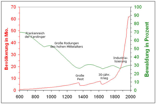 Bevölkerungsentwicklung und Anteil des Waldes an der Gesamtfläche, alte Länder vom frühen Mittelalter bis heute. Wie stark das Land von Wald bedeckt war, hing in Mitteleuropa bis zur Industrialisierung vor allem von der Bevölkerungsdichte ab. Bis um 1800 lebten etwa 90 % der Menschen von der Landwirtschaft. Größere Veränderungen in der Bevölkerungszahl waren daher stets mit Rodungen oder der Wiederausbreitung des Waldes verbunden. Diesen engen Zusammenhang hat erst die Industrialisierung aufgebrochen. (Grafik: Winfried Freitag)