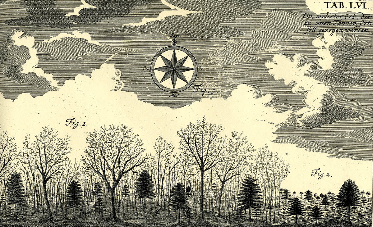 Der Text oben rechts im Bild lautet: "Ein melirter Ort, der zu einem Tannen Orte soll gezogen werden." Ein "melirter Ort" ist ein Mischwald. Mit Tannen wurden im 18. Jh. allgemein Nadelbäume bezeichnet. Die Tafel zeigt, wie ein Mischwald in eine Nadelholzmonokultur umzuwandeln ist. Das damalige forstliche Ideal war also dem heutigen genau entgegengesetzt. Abb. aus: Johann Andreas Cramer, Anleitung zum Forst-Wesen, Braunschweig 1766. (Museum Wald und Umwelt, Ebersberg, Inv.-Nr. ebe177)