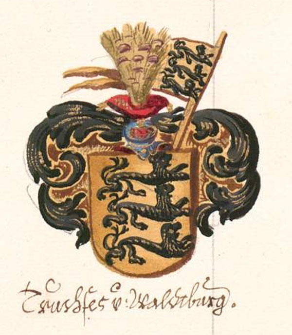 Kolorierte IIlustration des Wappens der Truchsesse von Waldburg. (in: Des Johann Michael Wilhelm von Prey, freisingischen Hofcammer-Directors, Sammlung zur Genealogie des bayrischen Adels, in alphabetischer Ordnung, 1740 - Bayerische Staatsbibliothek, Cgm 2290 [28], fol.172)