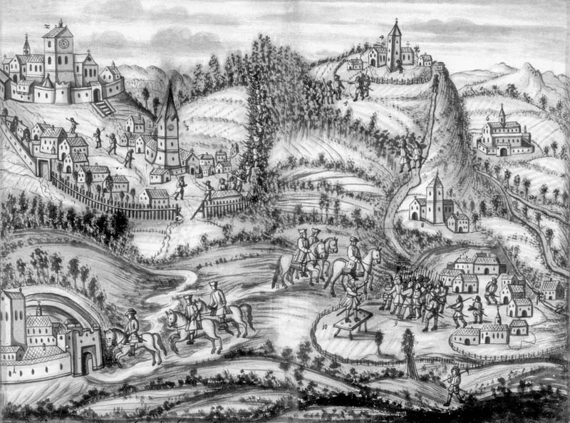 Jacob Murers Weißenauer Chronik des Bauernkrieges von 1525. Jacob Murer, Abt des Klosters Weißenau, Bild 3: Unruhe um Kloster Weißenburg. Im Bild zu sehen sind das Kloster Weißenau (1) unten links, Kloster Weingarten (2) oben links mit Altdorf (3), die Gemeinden Rappertsweiler (4) und Unter- und Obereschbach (8,9). Szene 1: Oben im Bild formiert sich der "Rappertsweiler Haufen". In dichter Reihe ziehen die Bauern von Altdorf nach Rappertsweiler. Szene 2: Die Weißenauer Bauern versammeln sich in Untereschach und werden von dem Bauernführer Stefan Rahl (auf Schemel) zum Anschluss an den Rappertsweiler Haufen aufgefordert. Szene 3: Die Geistlichkeit versucht vergeblich, die Bauern zu beschwichtigen, flüchtet aber dann ins Kloster. Faksimile im Auftrag des Weißenauer Abts Antonius Unold, 1725. (Hauptstaatsarchiv Stuttgart, Signatur B 523 Bd.58)