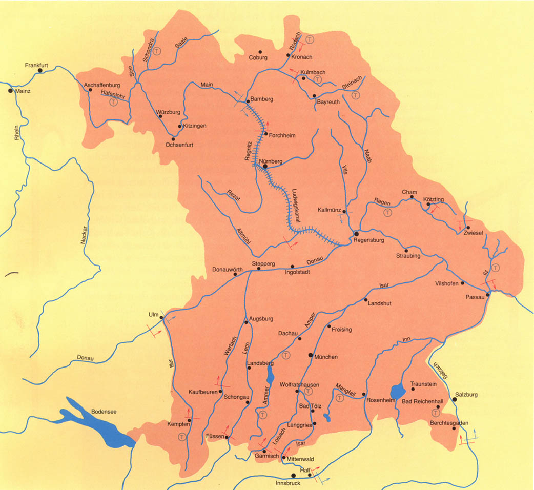 Floß- und schiffbare Flüsse im Gebiet des heutigen Bayern. Rote Pfeile markieren den Beginn floßbarer Flussabschnitte, blaue Pfeile schiffbare Strecken. Mit "T" sind Flussabschnitte bezeichnet, auf denen Triften stattfanden. (aus: Karl Filser, Flößerei auf Bayerns Flüssen: Zur Geschichte eines alten Handwerks [Hefte zur bayerischen Geschichte und Kultur 11], München 1991, 13)