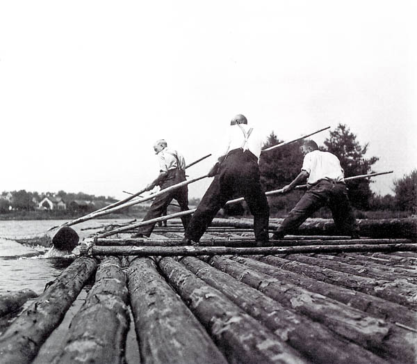 Der Einsatz des Floßhakens beim Bau eines Mainfloßes, 1937. (Flößermuseum Unterrodach)