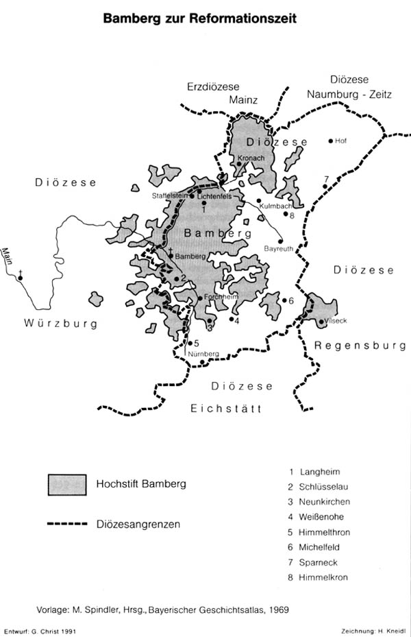 Hochstift und Diözese Bamberg um 1500. (aus: Günter Christ, Bamberg, in: Anton Schindling/Walter Ziegler (Hg.), Die Territorien des Reichs im Zeitalter der Reformation und Konfessionalisierung. Band 4, Münster 1992, 146)