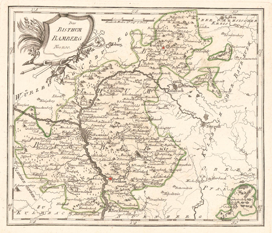 Das Bistum Bamberg im 18. Jahrhundert. Die Darstellung des Territoriums weicht geringfügig von der von 1759 ab. (aus: Schauplatz Der Fünf Theile Der Welt. Band II,1, Wien 1791, Nr. 200)