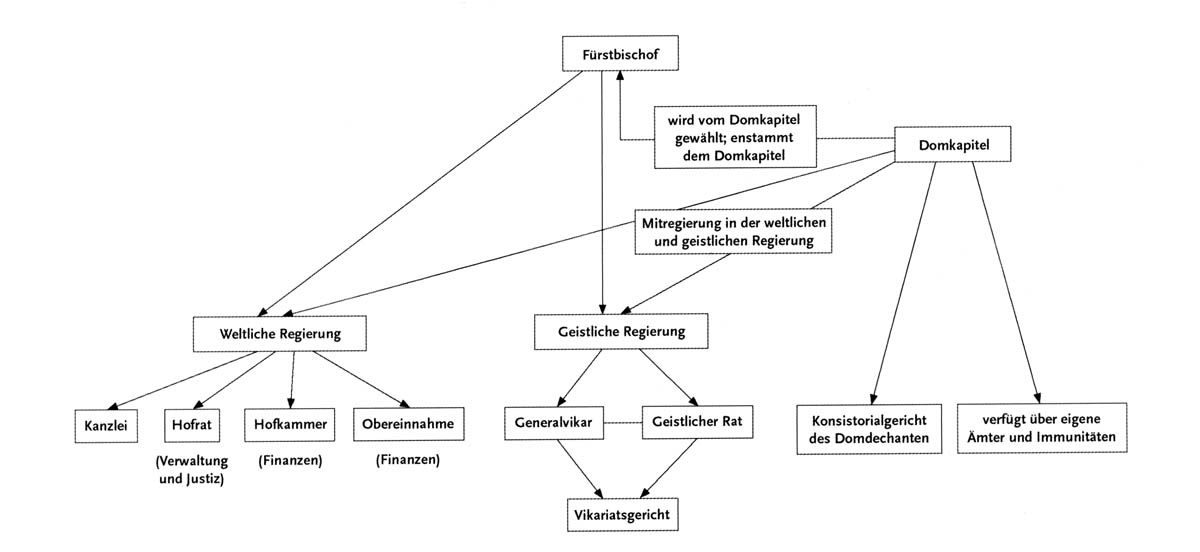 Organisationsschema der geistlichen und weltlichen Verwaltung des Bistums und Hochstifts Bamberg. (aus: Dieter J. Weiß, Fürstbischof und Domkapitel zur Schönbornzeit: Geteilte Herrschaft im Hochstift Bamberg?, in: Johannes Erichsen (Hg.), KaiserRäume - KaiserTräume. Forschen und Restaurieren in der Bamberger Residenz, München 2007, 21-27, hier: 23)