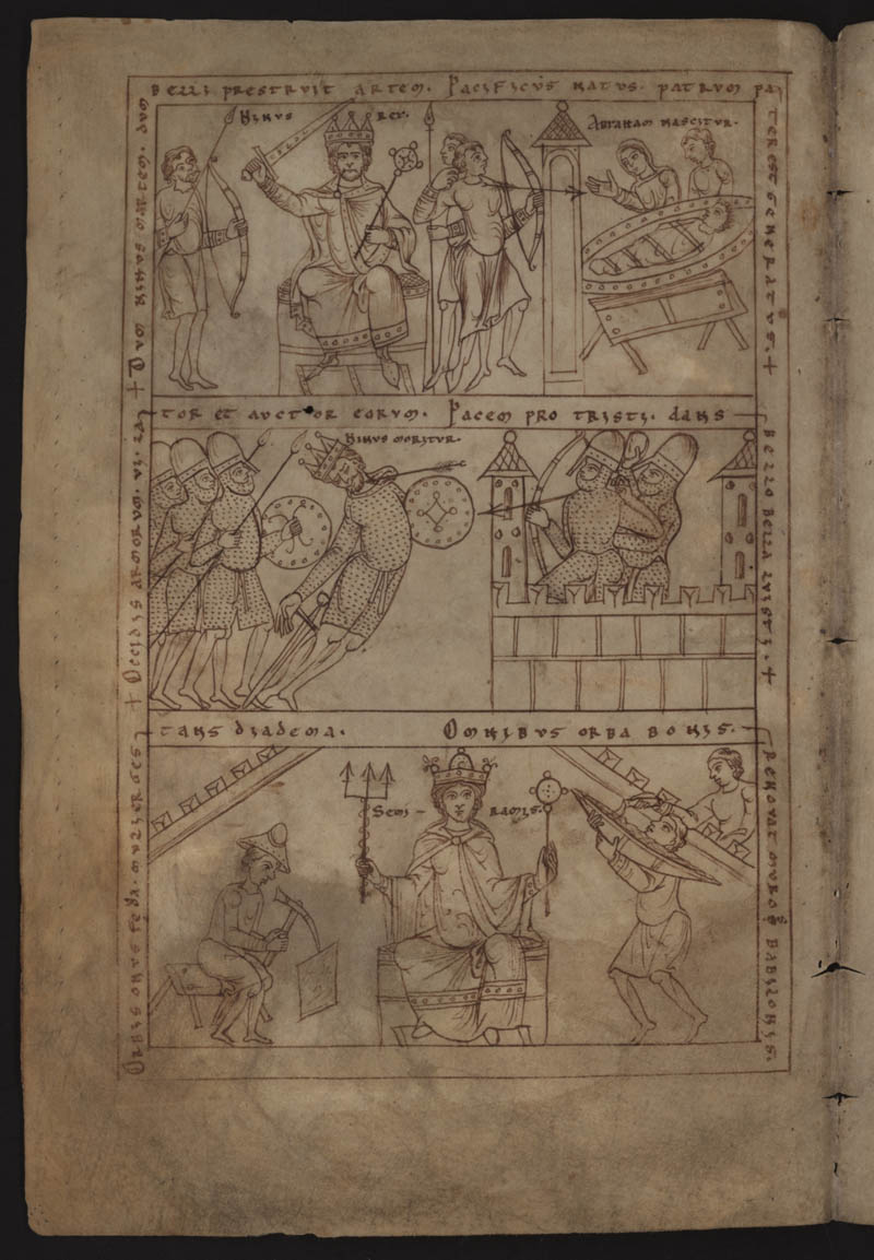 Bildseite zur Weltchronik des Otto von Freising (reg. 1138-1158). Auf dieser ist zu sehen: oben: König Ninus; die Geburt Abrahams, Mitte: der Tod des König Ninus, unten: Königin Semiramis. (Thüringer Universitäts- und Landesbibliothek Jena, Cod. Bose q. 6, Weltchronik des Otto von Freising, fol. 10v)
