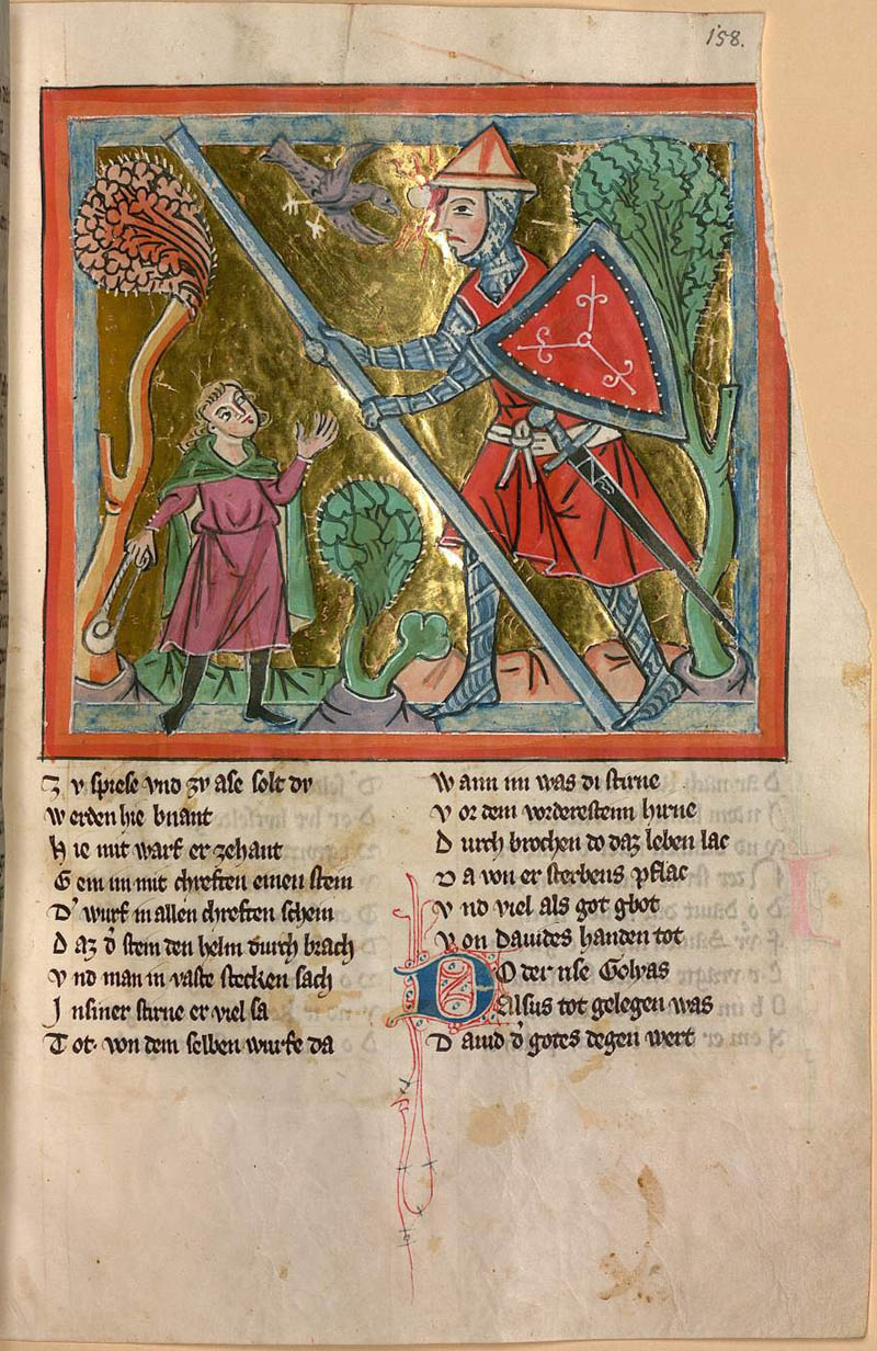 Darstellung von David und Golitath in der Weltchronik des Rudolf von Ems (ca. 1200–etwa 1254). (Bayerische Staatsbibliothek, Cgm 6406, fol. 158r)