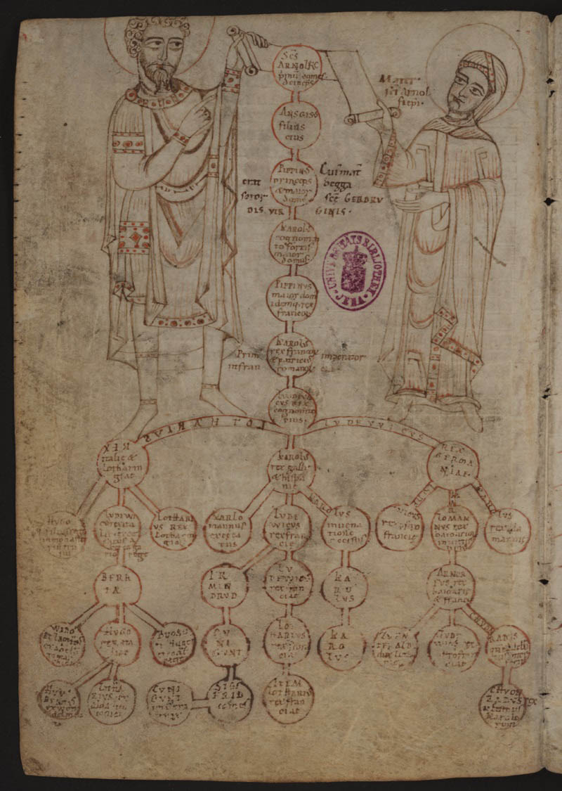 Stammtafel der Karolinger in der Weltchronik des Frutolf von Michelsberg (gest. 1103). (Thüringer Universitäts- und Landesbibliothek Jena, Cod. Bose q. 19, fol. 152v)