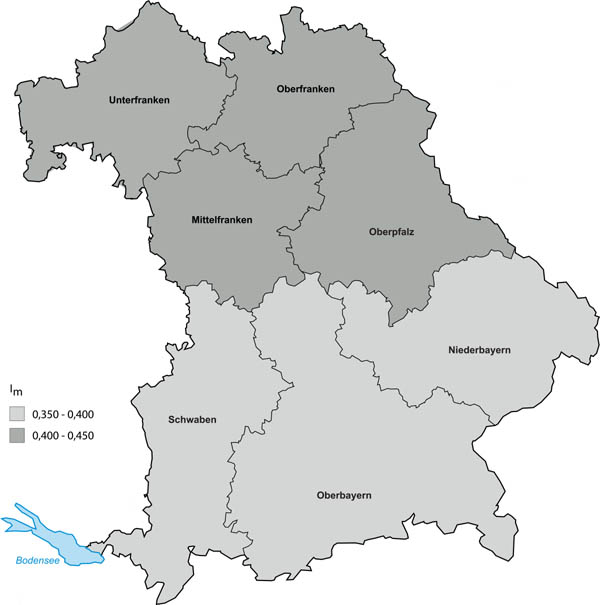 Princeton-Index des Anteils verheirateter Frauen im Alter zwischen 15 und 50 (Index Im), 1870. In den südlichen Regierungsbezirken Bayerns lag 1870 der Anteil der Frauen zwischen 15 und 50 Jahren, die verheiratet waren, nur bei 35-40 %, in den nördlichen bei 40-45 %.