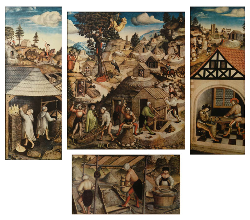 Annaberger Bergaltar (Rückseite), Hans Hesse 1522. Das Annaberger Altarbild ist ein eindrucksvolles Zeugnis des zweiten "Berggeschreyes" nach den Silberfunden im sächsischen Erzgebirge, das den wirtschaftlich-kulturellen Aufstieg der Region am Ende des Spätmittelalters begründete. (Foto: Wikimedia Commons)