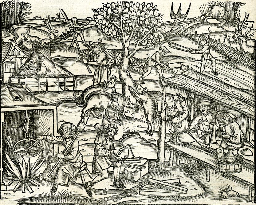 Dorfszene, im Hintergrund Wild, das über die Zäune auf die Felder drängt. Bauern suchen es zurückzuhalten. Holzschnitt eines unbekannten Meisters, in: Opera Vergiliana, Lyon 1515 u. 1517. (Foto/Bildrechte: Museum Wald und Umwelt, Ebersberg)