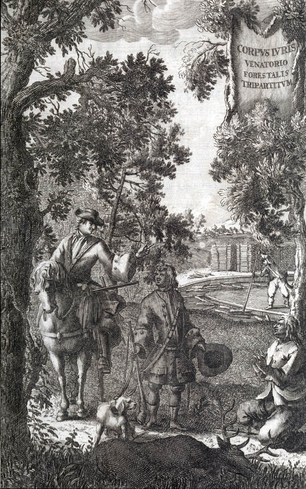 Wildernder Untertan bittet kniend um Gnade. Titelkupfer aus Ahasver Fritschs (1629-1701) Corpus Iuris Venatorio Forestalis, Leipzig 1702. (Bayerische Staatsbibliothek)