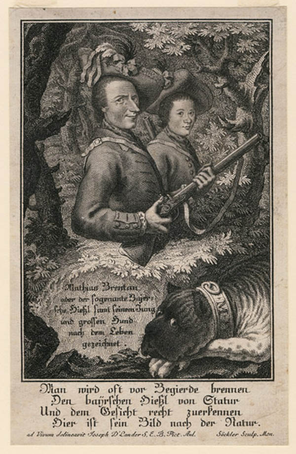 Matthias Klostermayer und der ""Bub"" Andreas Mayr, im Vordergrund der Hund Tyras. Kupferstich von Johann Michael Söckler, um 1770. (Münchner Stadtmuseum, Graphiksammlung, Inv. M.S.IV/127)