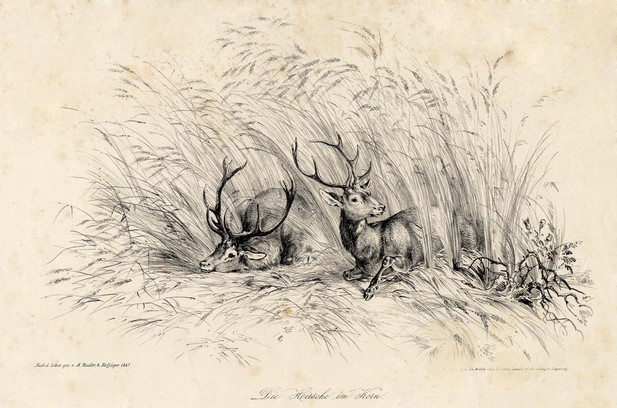 Die Hirsche im Korn, Zeichnung von Max Haider, 1847. (Foto/Bildrechte: Museum Wald und Umwelt, Ebersberg)