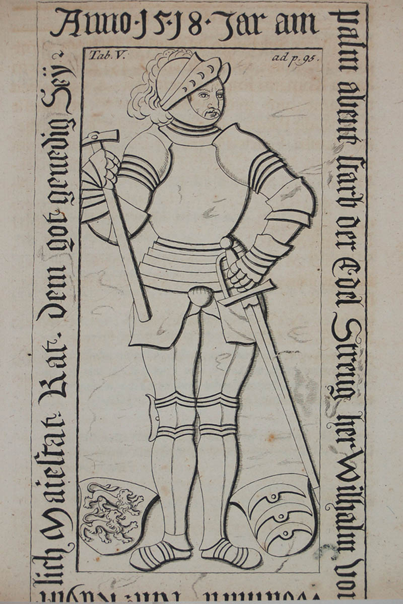 Epitaph des Wilhelm von Wolfstein, ca. 1518, Stich einer Nachzeichnung von ca. 1725. (in: Johann David Köhler, Historica Genealogica Dominorum et Comitum de Wolfstein, Frankfurt a. Main 1726, 93)