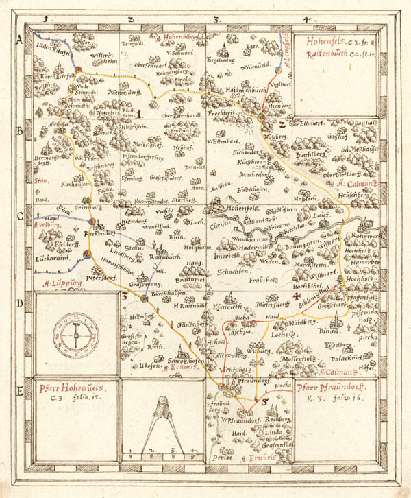 Karte der Herrschaft Hohenfels, angefertigt für die Pfalz-Neuburger Verwaltung von Christoph Vogel (1554-1608) und Matthäus Stang (1560-1620), um 1600. (Bayerisches Hauptstaatsarchiv, Plansammlung 3594)