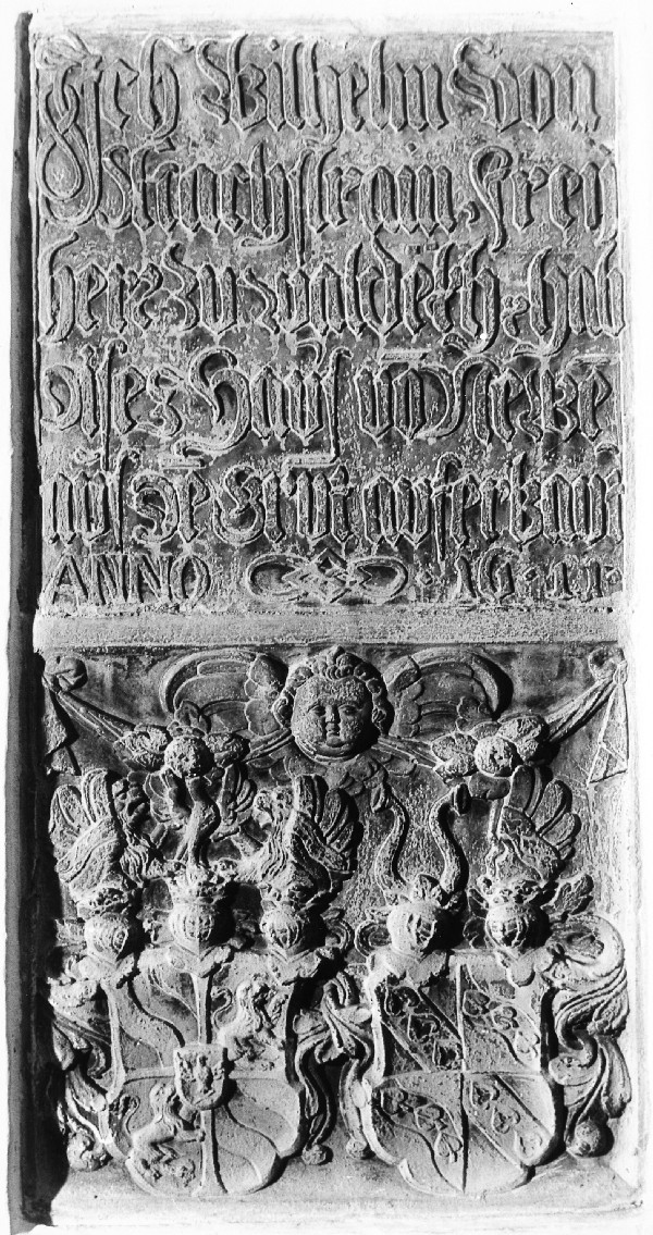 Eine Inschriftentafel hält die Erbauung des Pflegschlosses durch Wilhelm von Maxlrain im Jahr 1611 fest [Foto: Bayerisches Landesamt fürDenkmalpflege]