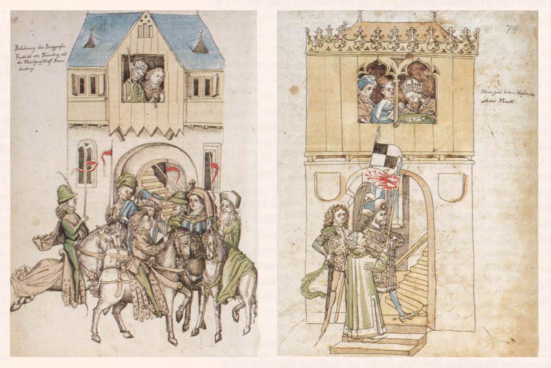 Belehnung des Burggrafen Friedrich VI. von Zollern mit der Mark Brandenburg am 18. April 1417 (1. Teil). Illustrationen aus Ulrich Richentals Chronik des Konzils zu Konstanz (1417), fol. 73v, 74r, um 1464. (Rosgartenmuseum Konstanz)
