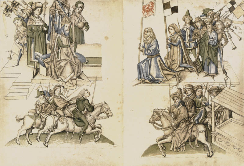Belehnung des Burggrafen Friedrich VI. von Zollern mit der Mark Brandenburg am 18. April 1417 (2. Teil). Illustrationen aus Ulrich Richentals Chronik des Konzils zu Konstanz (1417), um 1464, fol. 74v und 75r. (Rosgartenmuseum Konstanz)