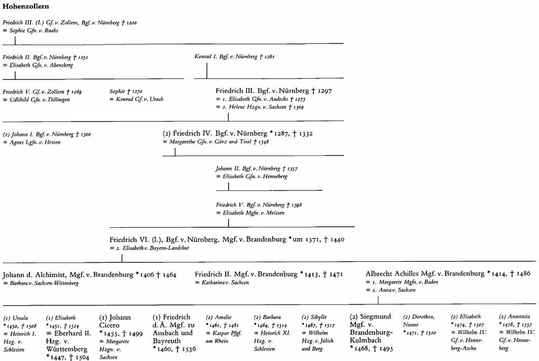 Stammtafel der Hohenzollern. Aus: A. Wendehorst, Hohenzollern, in: Lexikon des Mittelalters, Bd. 5, Stuttgart [1977-1999], Sp. 83-84. (Brepolis Medieval Encyclopaedias - Lexikon des Mittelalters Online)