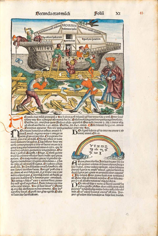 Schedelsche Weltchronik: Holzschnitt mit der Darstellung des Baus der Arche Noah als Beginn des 2. Weltalters. (Bayerische Staatsbibliothek Rar 287, fol. 11)