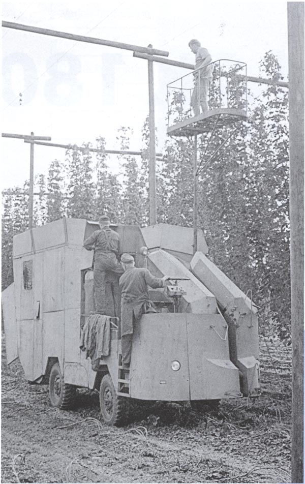 Fahrbare Pflückmaschine im Einsatz bei Geisenfeld (Lkr. Pfaffenhofen a. d. Ilm), 1962. Gebaut von der in Geisenfeld ansässigen Firma Wolf. (Foto: Deutsches Hopfenmuseum Wolnzach)