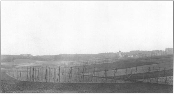Landschaft mit Hopfengerüsten bei Lohwinden (Gde. Wolnzach, Lkr. Pfaffenhofen an der Ilm), vermutlich 1929. (Foto: Deutsches Hopfenmuseum Wolnzach)