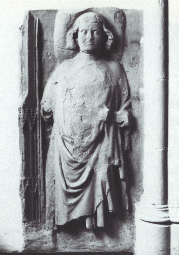 Grabplatte Graf Hugos I. von Montfort, Anfang 13. Jahrhundert. Ursprünglich in der Johanniterkirche, jetzt im Liebfrauendom in Feldkirch (aus: Elmar Vonbank, Die Montforter [Katalog des Vorarlberger Landesmuseums 103], Bregenz 1982, Kat. Nr. 449)