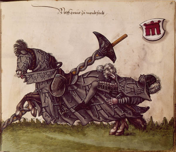 Graf Wolfgang I. von Montfort-Rothenfels (um 1489-1540) als Teilnehmer an einem Turnier. Aus dem Turnierbuch Herzog Wilhelms IV. von Bayern. (Bayerische Staatsbibliothek, cgm 2800, 21)