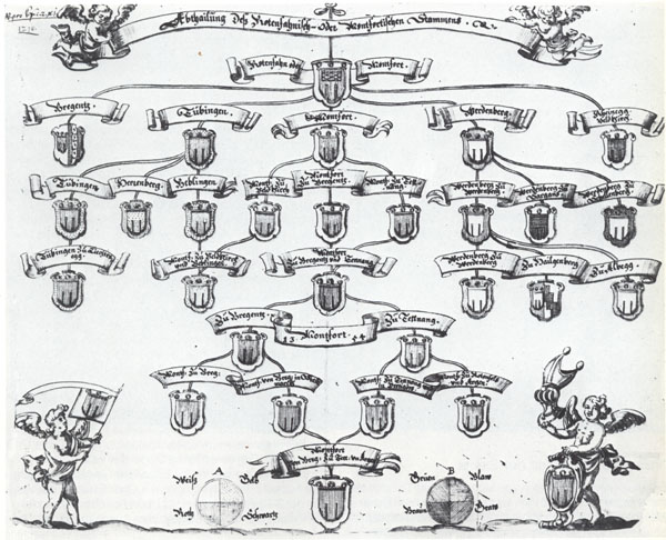 Wappentafel der Grafen von Montfort. (aus: P. Andreas Arzet, Montfortischer Ceder oder Unverwesner Stammenbaum der Uhralten Hochberühmten Grafen zu Montfort, Konstanz 1660/70; Bayerische Staatsbibliothek München, Cgm 6365(3, 1210)