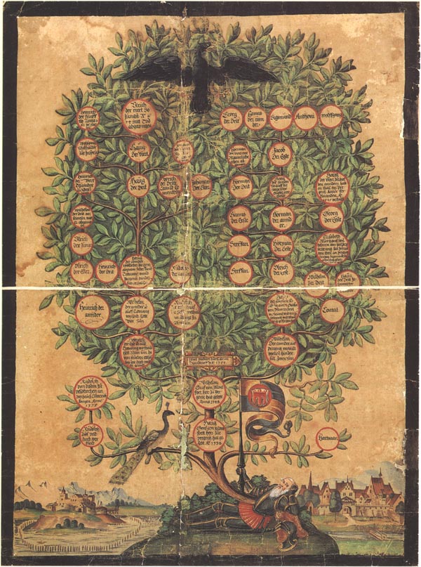 Stammtafel der Grafen von Montfort, um 1575. Mit Ansichten von Langenargen und Tettnang. Entstanden nach dem Aussterben der älteren Tettnanger Linie 1574 zum Nachweis der Erbberechtigung durch die Linie Bregenz-Beckach. (Hauptstaatsarchiv Stuttgart, Bestand: J 90 Nr. 12a)