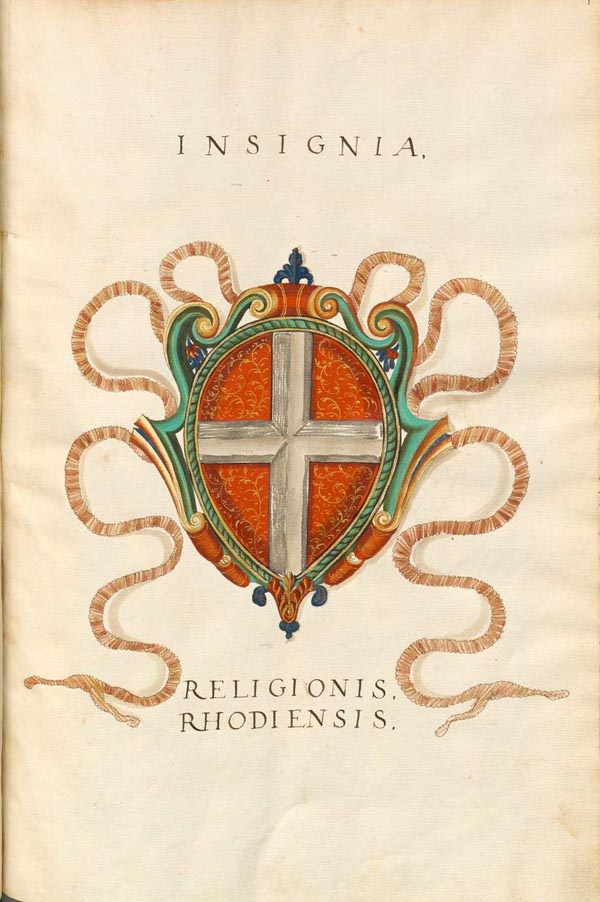 Wappen des Johanniterordens. Die Bezeichnung "Rhodensis" nimmt auf den Sitz des Ordensgroßmeisters auf Rhodos (bis 1522) Bezug. (BSB Cod.Icon. 269, fol. 1)