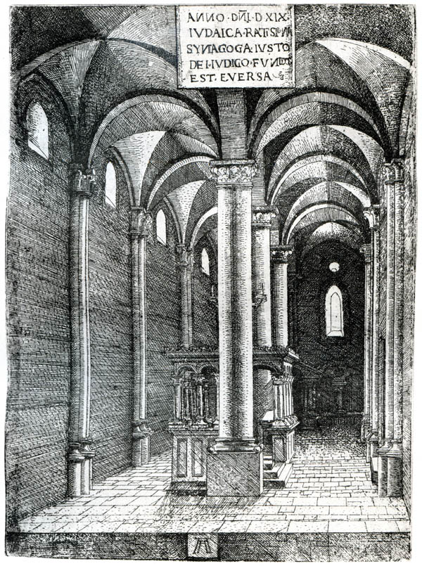 Innenraum der Synagoge in Regensburg kurz vor ihrer Zerstörung 1519. Radierung von Albrecht Altdorfer (gest. 1538). (aus: Hermann Voss, Albrecht Altdorfer und Wolf Huber [Meister der Graphik 3], Leipzig 1910, Tafel 29a)