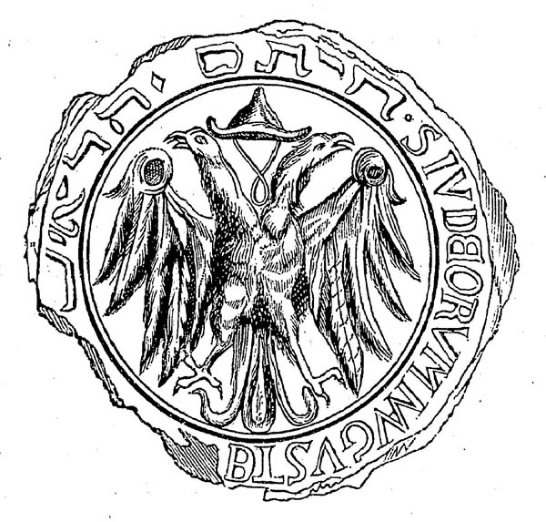 Augsburger Judensiegel 1298. (aus: P. Jaffé, Ein Siegel der Juden zu Augsburg vom Jahre 1298, in: Literaturblatt des Orients. Berichte, Studien und Kritiken für jüdische Geschichte und Literatur 1842, Nr. 5, Sp. 73)