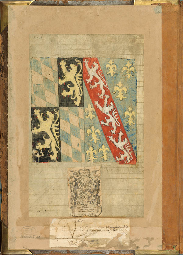Der vordere Spiegel des Einbands zeigt das Wappen Ludwigs VII [reg 1413-1447] und seiner Gemahlin Anne de Bourbon [ca 1380-1408] [Foto: Bayerische Staatsbibliothek; Leihgabe Universitäts- und Forschungsbibliothek Erfurt/Gotha, Forschungsbibliothek Gotha, Memb I 11[Einband]]
