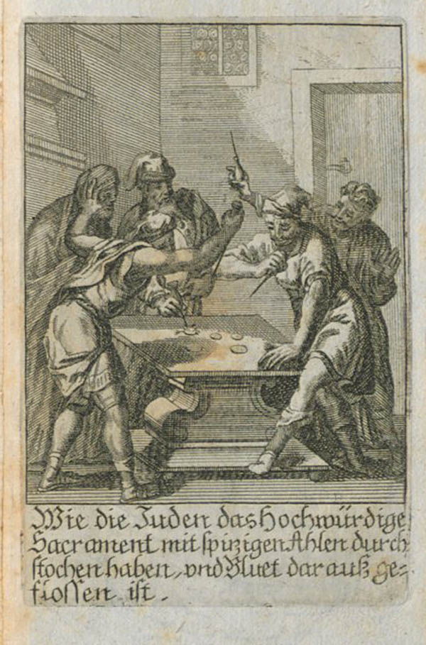 Darstellung einer angeblichen Hostienschändung, 1716. Eine ähnliche Bildtafel hing als Teil eines 14-teiligen Zyklus, der die Enstehung der "Deggendorfer Gnad" erklärt, 1710-1969 in der Deggendorfer Kirche zum Hl. Grab. Der gesamte Zyklus wird in ähnlicher Gestaltung in einem Einblattdruck von 1749 dargestellt. In: Warhaffte History, Was sich mit dem Hochwürdigisten Sacrament des Altars zu Deggendorff, durch unmenschliche geübte Boßheit der Juden, verloffen. Mit schönen Kupffern geziehret, Regenspurg 1716, 15. (Bayerische Staatsbibliothek)