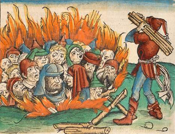 Darstellung eines Judenpogroms in der Schedelschen Weltchronik, Nürnberg 1493. Im dazugehörigen Text wird auf das Pogrom in Deggendorf 1338 angespielt. (Bayerische Staatsbibliothek, Rar 287, fol. 230v)