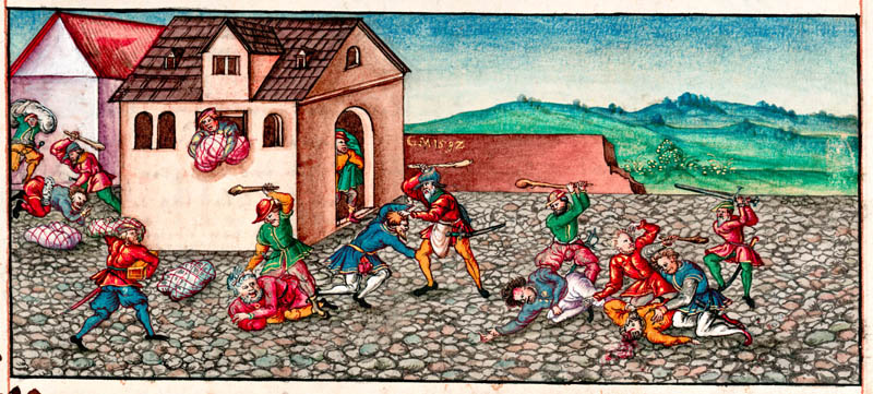 Im Jahr 1336 kam es im südlichen Teil des Bistums Würzburg zu Judenpogromen. Ausschnitt aus der Bischofschronik des Lorenz Fries (1489-1550). (Universitätsbibliothek Würzburg, M.ch.f.760, fol. 257v)