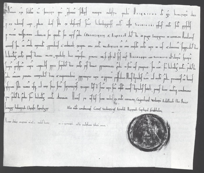 Urkunde Herzog Heinrichs VII. von Bayern von 1045 für das Bistum Bamberg, die älteste erhaltene Siegelurkunde eines bayerischen Herzogs, wahrscheinlich im Umkreis des Bamberger Bischofs geschrieben. Ihre Gestaltung ist an die Königsurkunden angelehnt. (Bayerisches Hauptstaatsarchiv, Bamberger Urk. 111)