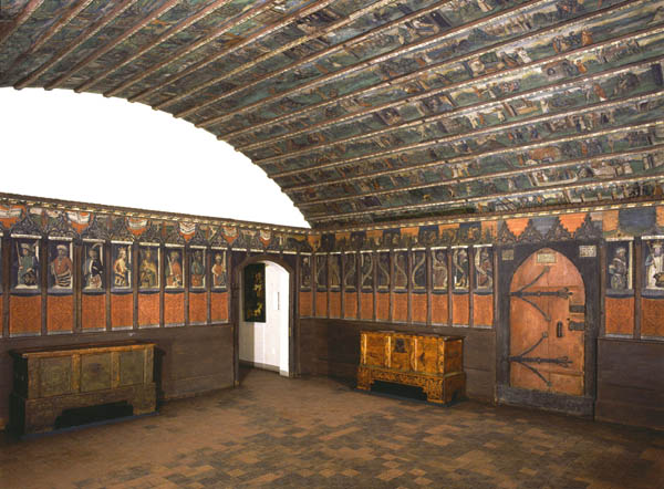 Darstellungen der Kurfürsten in der Amtsstube aus dem Zunfthaus der Weber in Augsburg: ausgemalt 1457 von Peter Kaltenhoff, instand gesetzt 1538 von Jörg Breu d J und 1601 von Johann Herzog. (Bayerisches Nationalmuseum, Inv.Nr. MA 856-860)